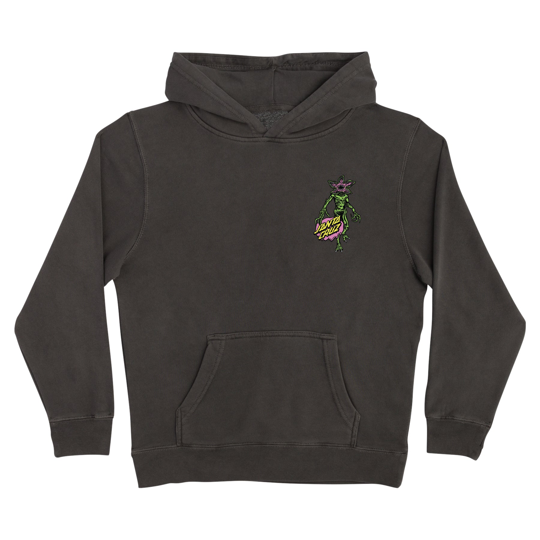 The Santa Cruz x Stranger Things Demogorgon Dot youth regular fit, midweight, pullover hooded sweatshirt features small front and large back Santa Cruz x Stranger Things Demogorgon Dot artwork printed in soft hand ink.